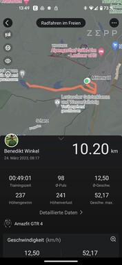 Hicimos un seguimiento del recorrido con el reloj de prueba durante una excursión en bicicleta junto con el Garmin Venu 2. Las imágenes de satélite muestran que la ruta se reproduce con precisión. Los radios se detectan con fiabilidad y la longitud total del recorrido también se muestra correctamente.