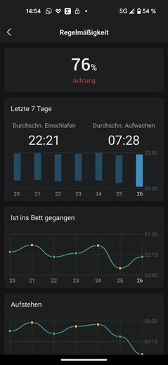 El tiempo de las fases individuales también se evalúa y compara con el de otros usuarios. También se indica el tiempo total de sueño. Los datos pueden introducirse para días, semanas, meses y años individuales. Hasta aquí, todo normal.