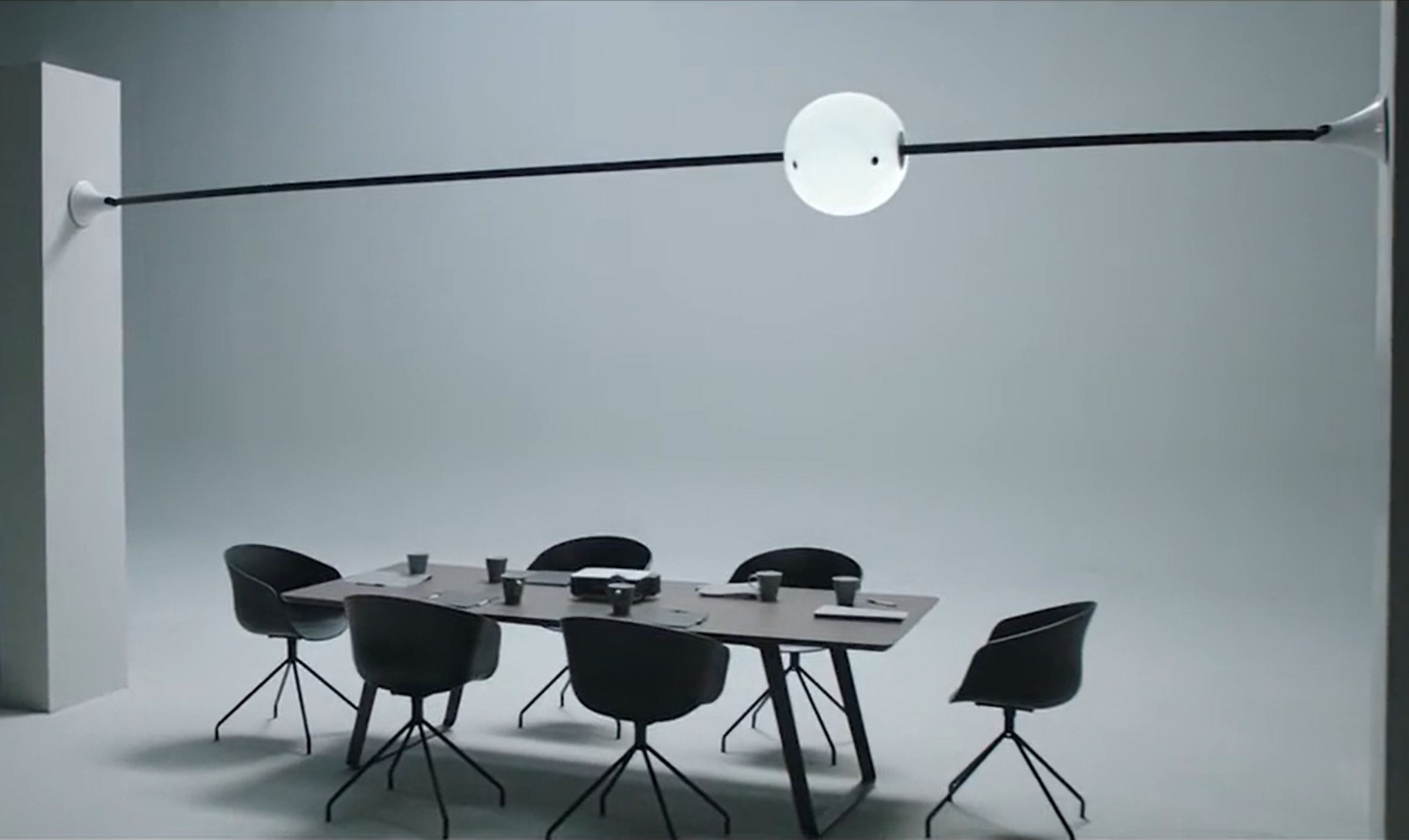 Visualmente, el objeto esférico es ante todo una lámpara, pero una lámpara inteligente. En lugar de colgar del techo, se desplaza por un raíl montado entre dos paredes, lo que le permite recorrer toda la habitación cerca del techo (o en cualquier otro lugar). Esto permite a la lámpara "seguir" literalmente al ocupante y proporcionarle luz allí donde la necesite. ¿Sentado en el sofá? La esfera resplandeciente flota por encima. ¿Levantándose para trabajar en un escritorio? La lámpara se desplaza por el raíl e ilumina el nuevo lugar.