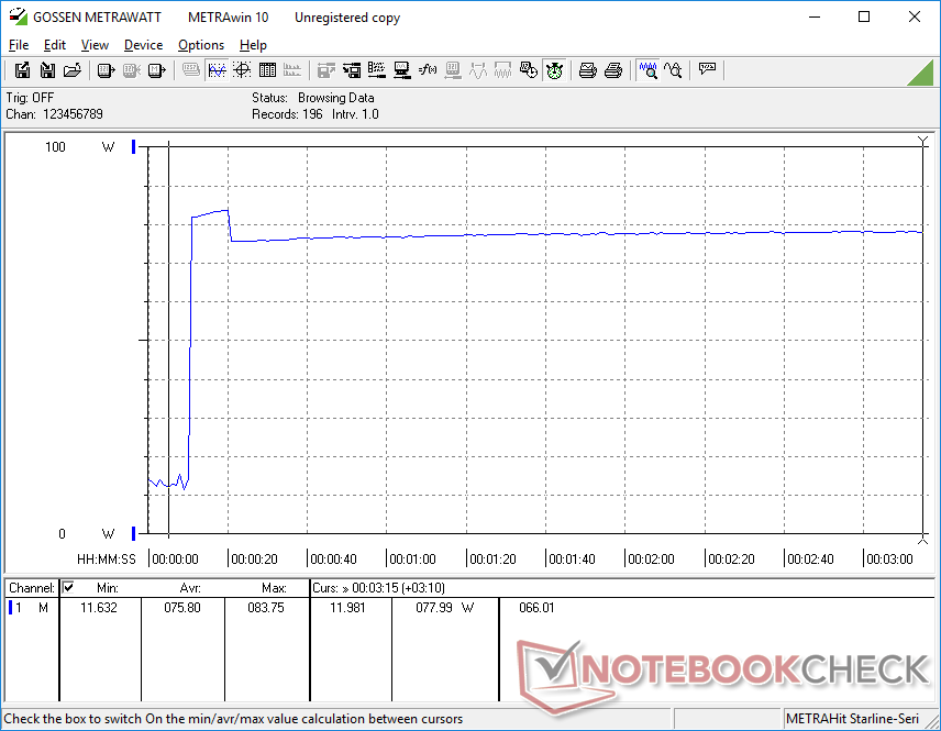 Registramos un consumo máximo de 82 W con el pequeño adaptador de CA de 90 W (12,5 x 5 x 3 cm) al ejecutar cargas extremas de Prime95 y FurMark.