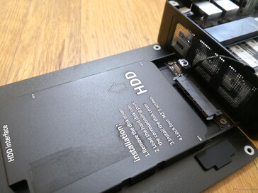 El panel inferior está asegurado por sólo cuatro tornillos Philips para facilitar el mantenimiento. Sin embargo, a diferencia de los tornillos de pulgar en un NUC de Intel, los tornillos aquí son mucho más pequeños y requerirán un destornillador para quitarlos. Una vez dentro, los usuarios tendrán acceso directo a 2x SODIMM, 3x bahías de almacenamiento, y luego el módulo WLAN. Desgraciadamente, se requiere un desmontaje adicional si se quiere limpiar los ventiladores duales que están en el otro lado de la placa base.