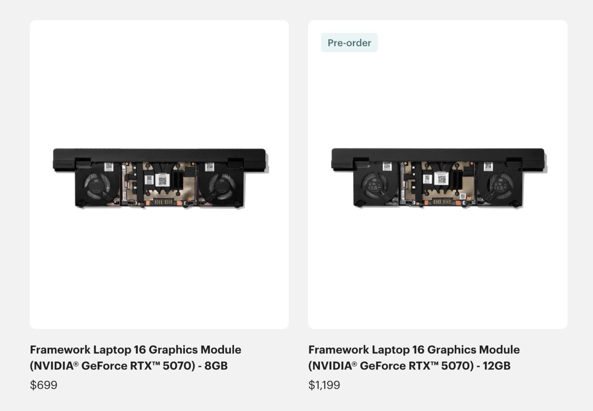 Los primeros portátiles para juegos con esta nueva versión de la GeForce RTX 5070 empezarán a comercializarse en las próximas semanas, pero Nvidia no ha anunciado oficialmente su precio. El marco ha abierto ya los pedidos anticipados de un módulo de actualización GeForce RTX 5070 de 12 GB para el portátil Framework Laptop 16, que se entregará a partir de junio. El precio es sorprendentemente alto: la GeForce RTX 5070 de 12 GB cuesta 1.199 dólares en lugar de 699 dólares como la variante con memoria gráfica de 8 GB. Esto significa que los clientes pagan un recargo de 500 dólares o un 71,5% por 4 GB o un 50% más de VRAM.