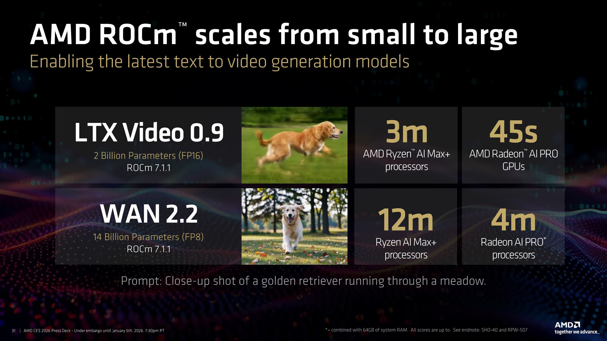 ROCm 7.1 también ha demostrado un rendimiento impresionante en modelos de generación de texto a vídeo como LTX Video 0.9 y Wan 2.2, completando el requisito de la solicitud en tan sólo 3 minutos en el procesador Ryzen AI Max APU y en 45 segundos en las GPU Radeon AI Pro.