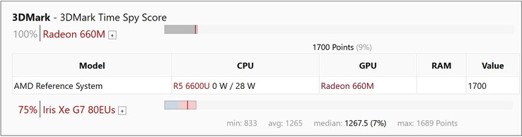 A primera vista, parecería que el i5-12600H sería la mejor selección en una situación de enfrentamiento; sin embargo, esta vez el as en la manga de AMD ha sido la presencia de las iGPU RDNA2. En el Ryzen 5 6600H está la Radeon 660Mque, a pesar de no ser la iGPU estrella de la serie, sigue superando a la iGPU de Intel. Por ejemplo, actualmente tenemos una comparación de puntuaciones en 3DMark Time Spy que posiciona la solución de AMD un 25 % por delante de la puntuación media de la Iris XE G7 80 EU y eso con una APU de menor potencia (Ryzen 5 6600U).