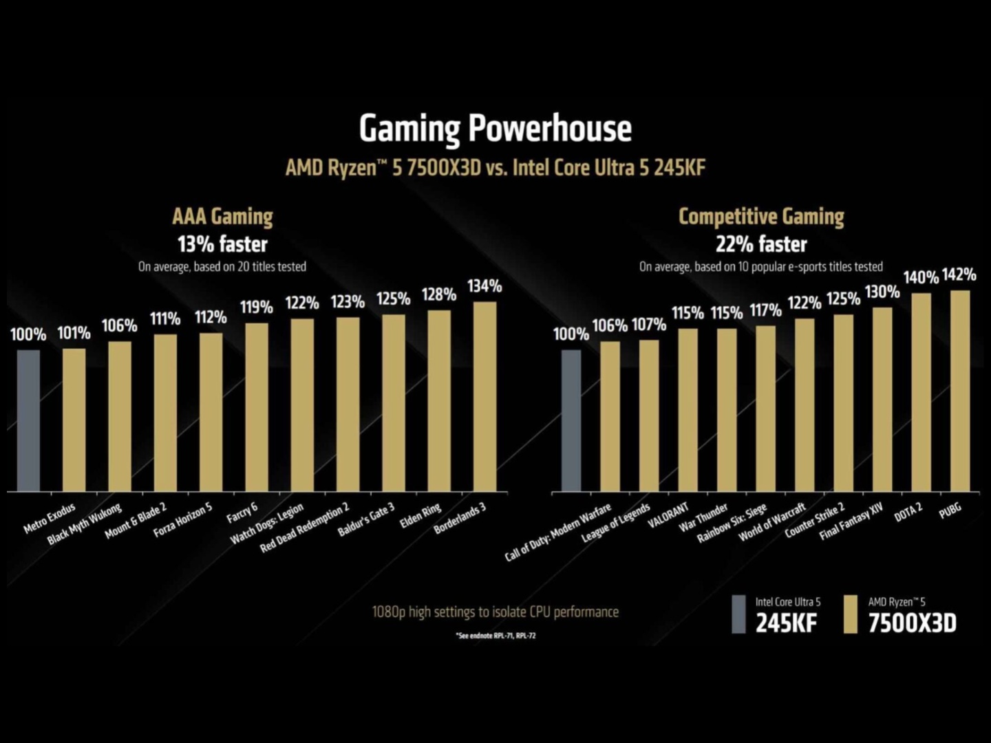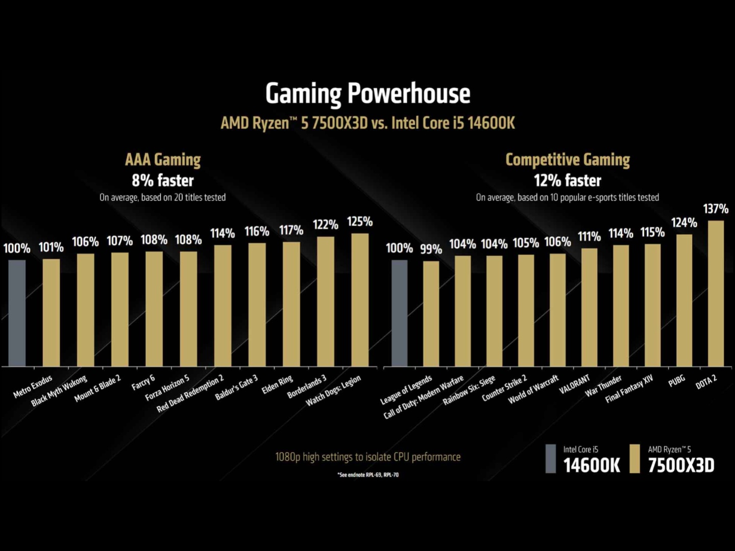 De forma similar, cuando se compara con el Core i5-14600K, AMD afirma que el Ryzen 5 7500X3D es un 8% más rápido en juegos AAA y un 12% más rápido en juegos competitivos.