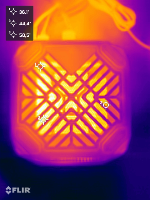 Bajo carga, la carcasa del Acemagic M1A Pro+ sólo se calienta moderadamente. Debido al diseño de la refrigeración, la parte trasera se calienta notablemente, más que el resto de lados, aunque aquí no se alcanzan puntos de calor extremos. El propio procesador sólo se calienta brevemente por encima de los 90 °C cuando se aplica el consumo de energía de hasta 140 vatios. A continuación, la temperatura de la APU se estabiliza en torno a los 79 °C.