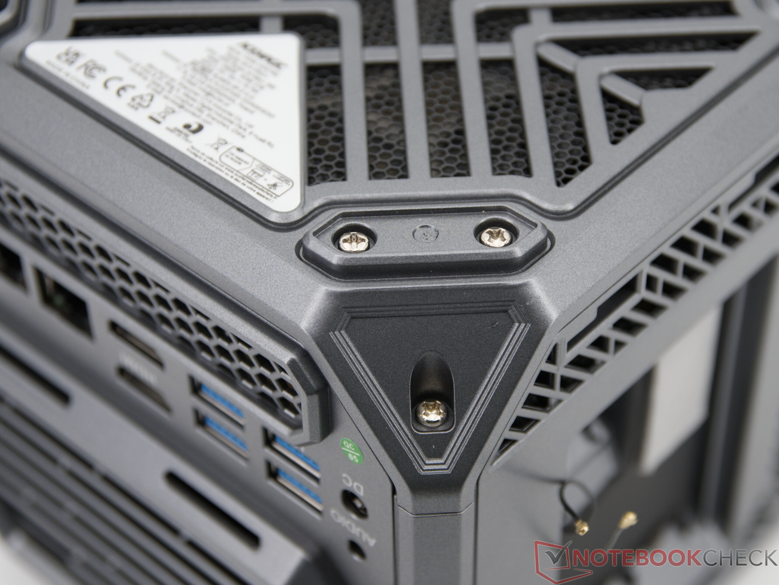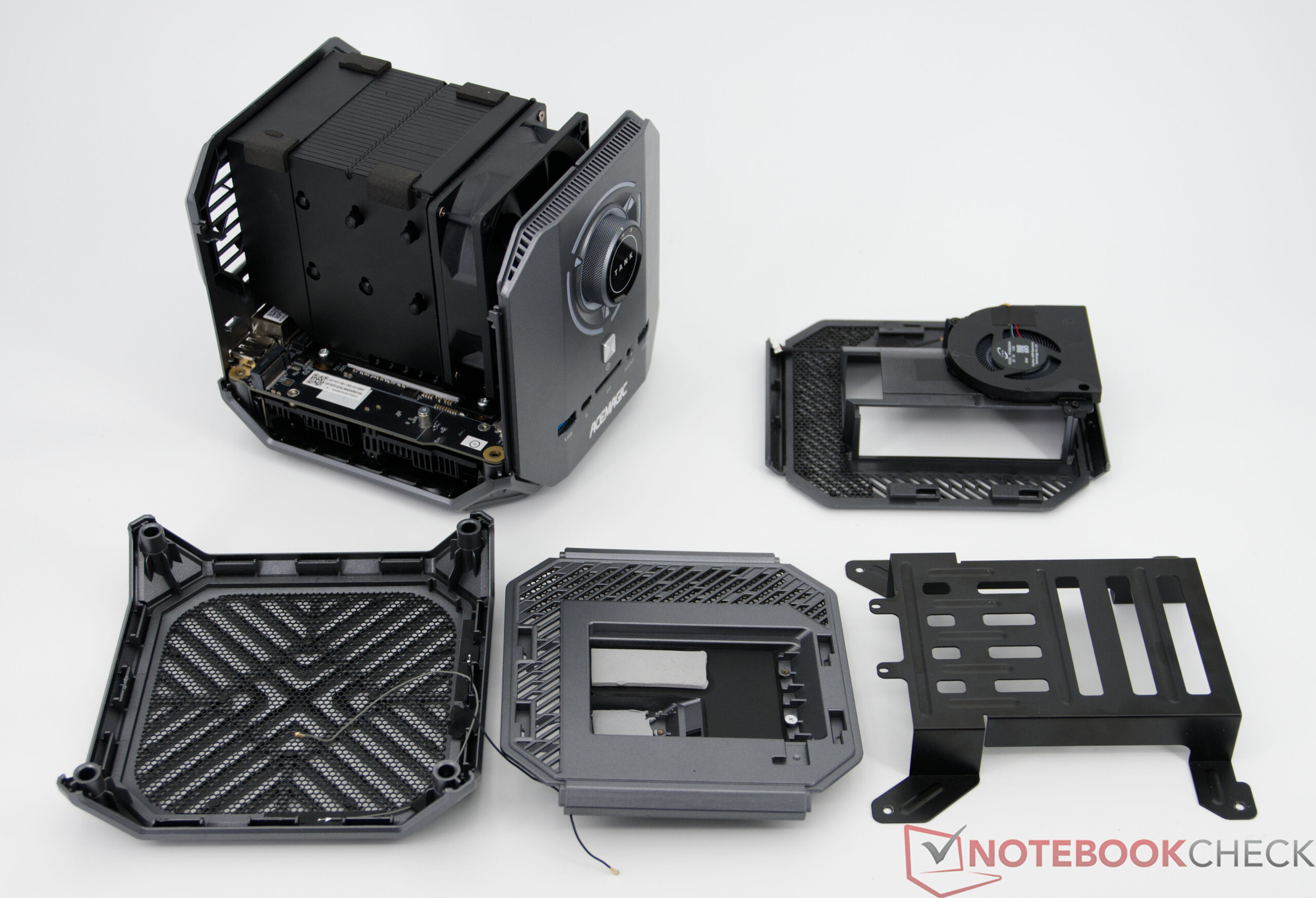 El Acemagic M1A Pro+ tiene dos solapas de mantenimiento en el lateral que se pueden abrir sin herramientas y permiten el acceso directo a la unidad SSD y al módulo WLAN. Aún quedan dos ranuras M.2 libres en nuestro dispositivo de prueba. Es posible desmontar completamente la carcasa, aunque resulta muy complicado. Muchos tornillos se encuentran bajo las cubiertas pegadas de las esquinas, que son muy difíciles de retirar sin causar daños. Resulta incomprensible por qué el fabricante dificulta el acceso completo al interior, especialmente en lo que respecta a posibles tareas de mantenimiento como la limpieza o la sustitución del ventilador.