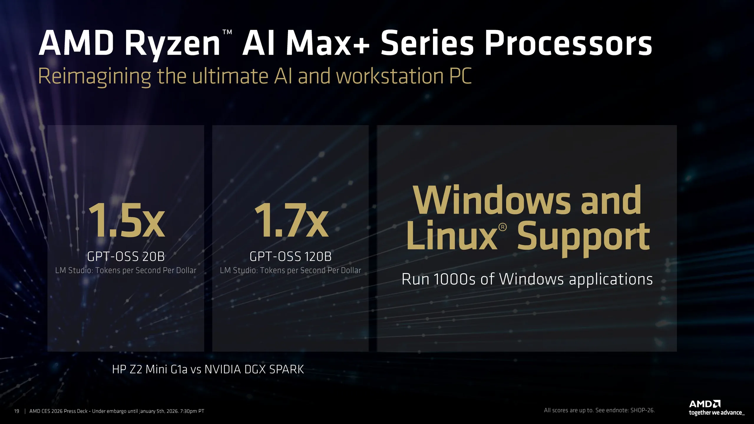 En el frente del rendimiento, AMD afirma que Ryzen AI Max+ ofrece 1,5x y 1,7x más token por segundo por dólar en LM Studio utilizando el modelo GPT-OSS 20B y GPT-OSS 120B, respectivamente, con un HP Z2 Mini G1a de 2.500 dólares ejecutando el Ryzen AI Max+ 395 frente al Nvidia DGX Spark de 4.000 dólares, ambos con 128 GB de memoria unificada.
