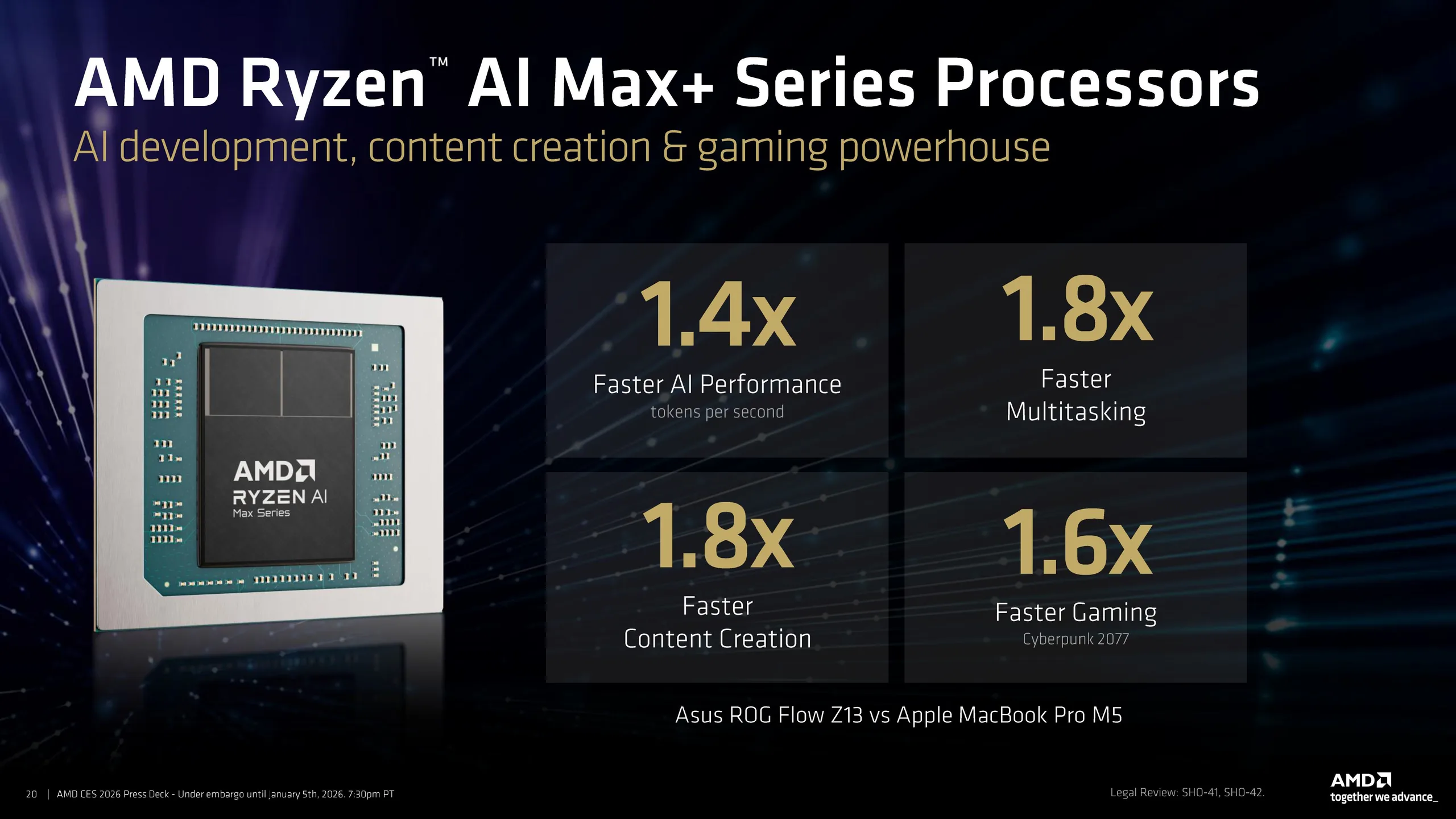 AMD también afirmó un rendimiento de IA 1,4 veces más rápido, 1,8 veces más rápido en multitarea y creación de contenidos, y 1,6 veces más rápido en juegos con un Asus ROG Flow Z13 equipado con el Ryzen AI Max+ 395 funcionando a 55 W (perfil silencioso) frente al Apple MacBook Pro 14 con un chip M5 de 10 núcleos (perfil Equilibrado) y 24 GB de RAM.