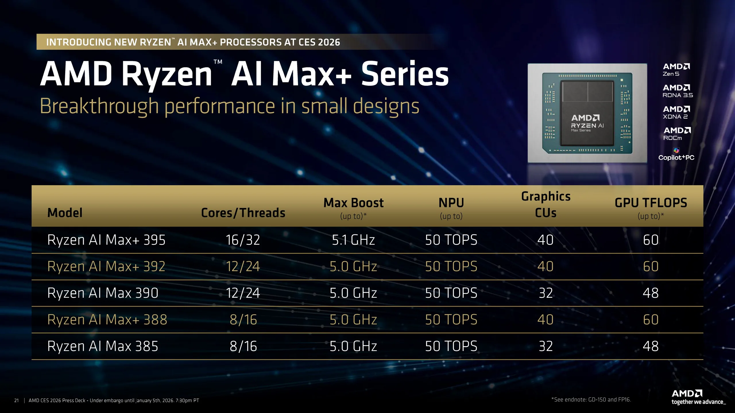 En el CES 2026, AMD presentará dos nuevas SKU en la línea Ryzen AI Max+: la Ryzen AI Max+ 392 y la Ryzen AI Max+ 388 dirigidas a los desarrolladores de IA.