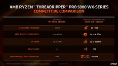 La compañía dijo que las modernas características de seguridad como Shadow Stack, que es básicamente la forma de AMD de prevenir los ataques de flujo de control y otros conjuntos de características de clase empresarial vienen incorporados en la serie Threadripper Pro 5000 WX a diferencia de Xeon W-3300 de Intel. AMD también ha destacado otras ventajas respecto a los procesadores para estaciones de trabajo basados en Ice Lake, como la disponibilidad de un mayor número de núcleos, mayores incrementos, una caché L3 mucho mayor y el doble de carriles PCIe.