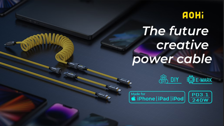 AOHi señala que puede transportar hasta 240W de potencia gracias a su compatibilidad con el último USB Power Delivery (PD) 3.1 más reciente. Por otra parte, el conjunto también está aparentemente hecho para iPhone/iPad (y iPod, por alguna razón); será interesante ver si el conjunto incluye finales cortos con Lightning conectores o no.