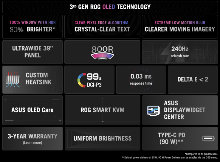 En definitiva, parece que el ROG Swift OLED PG39WCDM se basa en el mismo panel que el UltraGear OLED 39GS95QE (actualmente 1.499,99 $ en Amazon ) que LG puso a la venta el mes pasado. Como tal, el primero iguala al segundo con una profundidad de color de 10 bits, una cobertura del espacio de color DCI-P3 del 99%, tiempos de respuesta GtG de 0,03 ms y desviaciones de color Delta-E inferiores a 2. Además, ASUS equipa el ROG Swift OLED PG39WCDM con los siguientes puertos: