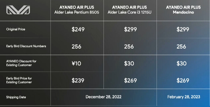 Actualmente, AYA NEO espera equipar todas las configuraciones del AIR Plus con la misma pantalla de 6 pulgadas y 1080p. La empresa no se ha pronunciado sobre las configuraciones de RAM y almacenamiento, pero espera igualar el precio delCore i3-1215Uy las configuraciones AMD Mendocino, con el modelo Pentium Gold 8505 costando entre 30 y 50 dólares menos, dependiendo de cuándo se pida una unidad. Como muestra la imagen inferior, AYA NEO espera enviar las unidades Intel Alder Lake a partir del 28 de diciembre de 2022, mientras que la versión AMD Mendocino llegará a finales de febrero de 2023. Además, el AMD Mendocino se enviará junto al AYA NEO 2 GEEK, otra versión del AYA NEO 2 que hemos cubierto por separado.