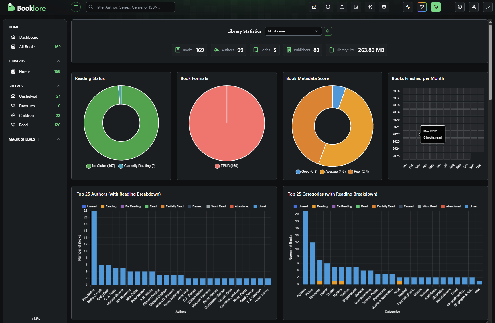 Booklore le permite alojar y gestionar su propia biblioteca de libros electrónicos. Es compatible con los principales formatos de libros y descargará los metadatos automáticamente para rellenar las portadas y obtener sinopsis de los libros. Los libros se pueden clasificar según las estanterías que usted mismo cree, y se pueden configurar distintos usuarios con acceso a diferentes bibliotecas. Puede importar una cantidad ilimitada de libros en la configuración inicial, o importarlos directamente a través de la interfaz web.