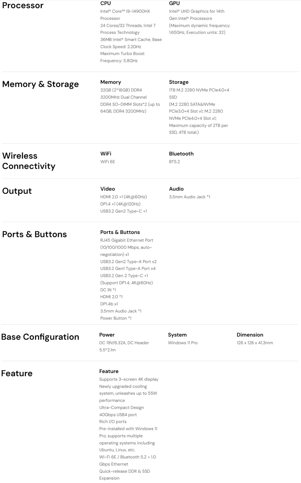 Aunque esta configuración de puertos es decente, habría sido genial ver que el mini PC tuviera un puerto USB4 o OCuLink. Sin ninguno de estos dos, el Acemagic M5 no se presenta como una opción ideal para los juegos, ya que la GPU integrada es bastante básica. Sin embargo, está bien equipado para la productividad y las cargas de trabajo de oficina. Consulte la hoja de especificaciones adjunta a continuación para obtener más información.