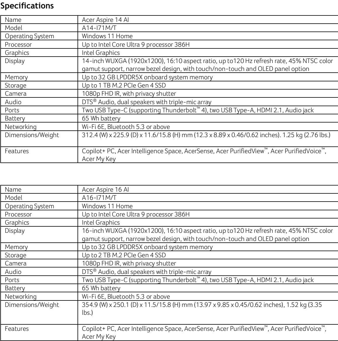 Los Aspire 14 AI y Aspire 16 AI son PC Copilot+ equipados con el procesador Intel Core Ultra 9 386H con hasta 32 GB de RAM LPDDR5x y una SSD M.2 NVMe de hasta 2 TB.