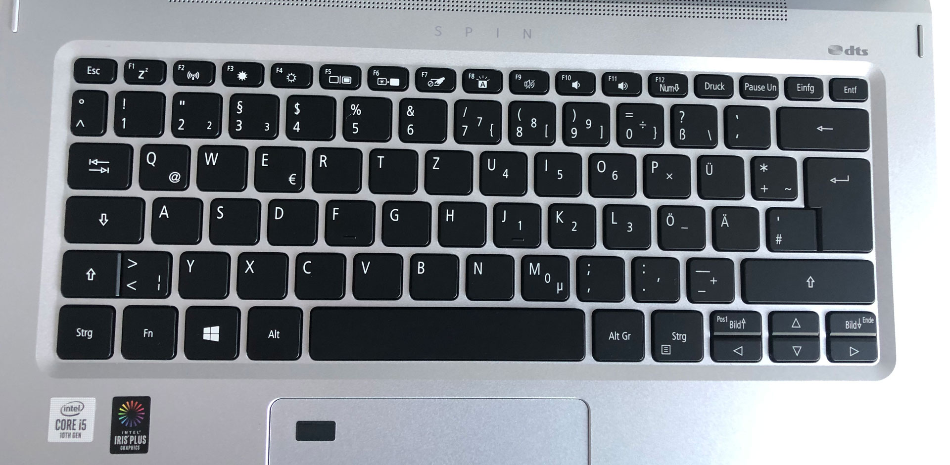 Debido a los bordes relativamente estrechos a la izquierda y a la derecha, Acer mete un teclado suficientemente grande en la carcasa compacta. Sin embargo, las teclas podrían ser un poco más grandes para permitir una posición más relajada de la mano, pero esto no es factible en un dispositivo de 14 pulgadas. Además de la disposición clásica y las funciones habituales de las teclas F, como el control del volumen y el brillo de la pantalla, no hay teclas especiales.