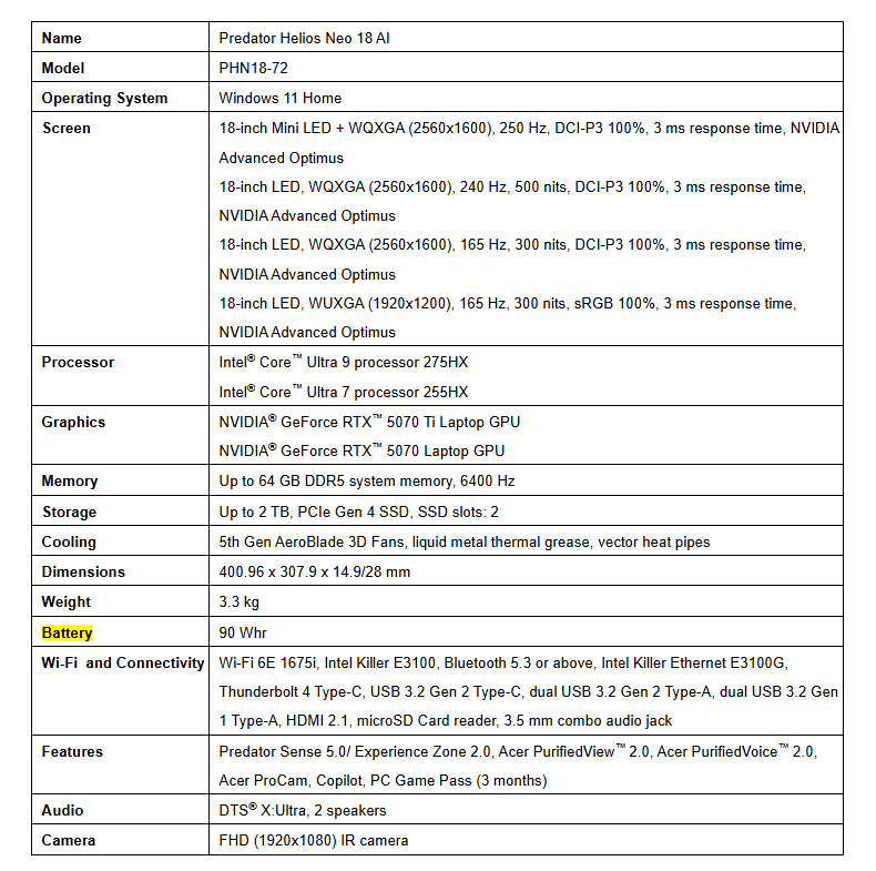 Bajo el capó, el Acer Predator Helios Neo 18 AI está impulsado por un recientemente lanzado Intel Core Ultra 9 275 HX o un procesador Intel Core Ultra 7 255 HX. Dispone de la GPU GeForce RTX 5070 Ti de Nvidia, que viene con el último DLSS 4 de Nvidia para aumentar los FPS, reducir la latencia y mejorar la calidad de imagen mientras se juega. Tiene una capacidad de hasta 64 GB de RAM DDR5 y 2 TB de almacenamiento SSD PCIe Gen 2.