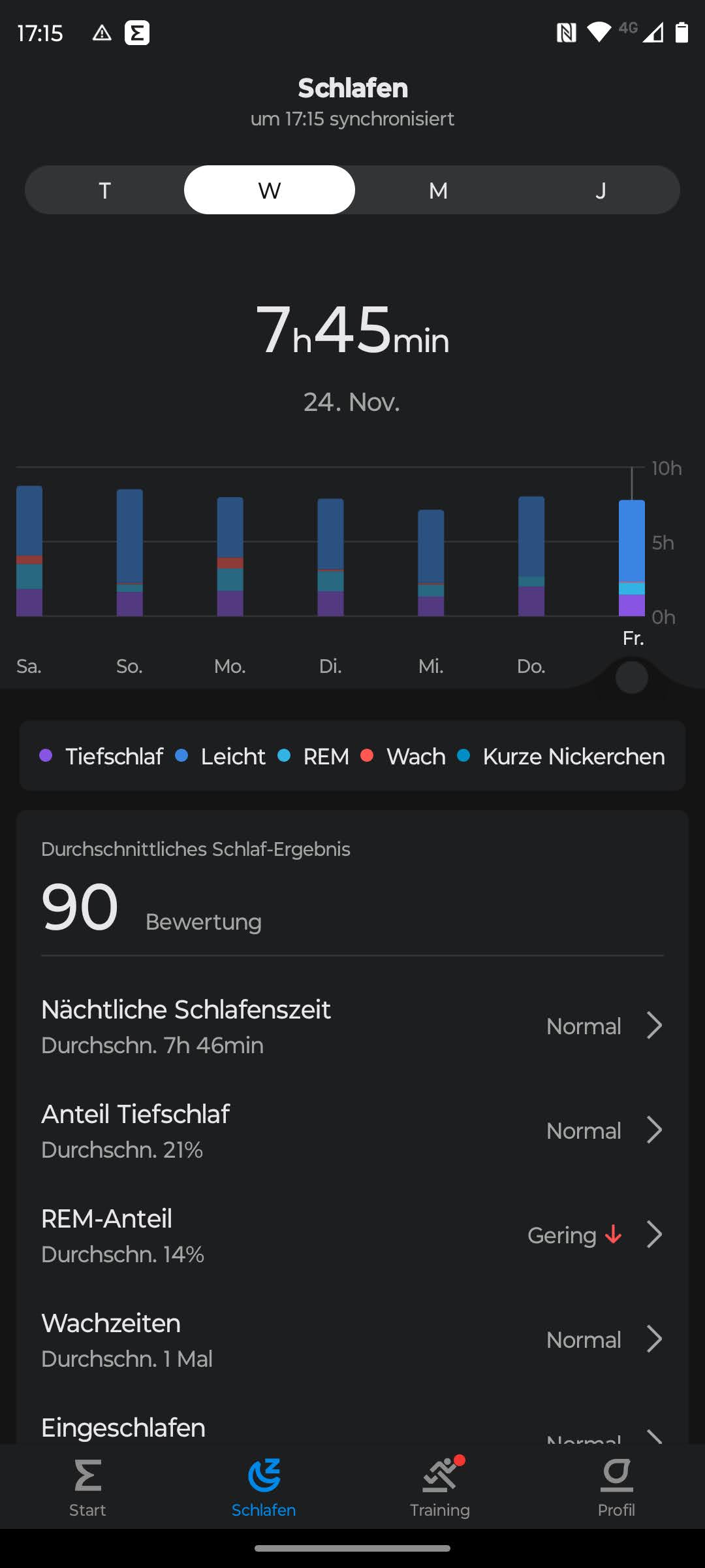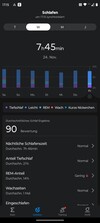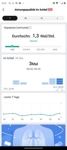 El software detalla el tiempo total de sueño y presenta un diagrama que representa las fases REM, ligera y profunda del sueño. Los tiempos de vigilia se identifican de forma fiable en la prueba, y la aplicación indica los tiempos de las fases individuales junto con la proporción de sueño total a la que contribuye cada fase. Los usuarios pueden controlar estos valores a lo largo de semanas y compararlos con los de otros usuarios.