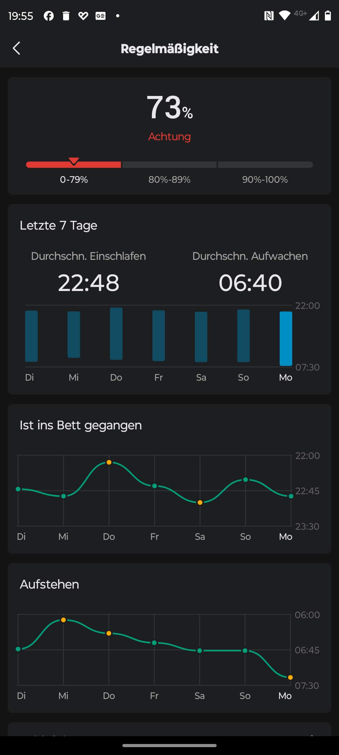 La app también evalúa la regularidad del sueño basándose en las horas de dormirse y despertarse de los últimos siete días. Se examina y evalúa el comportamiento del sueño, y los usuarios pueden crear un horario de sueño dentro de la app. Sin embargo, cabe destacar que el Amazfit Active no incluye un despertador inteligente que tenga en cuenta las fases del sueño.