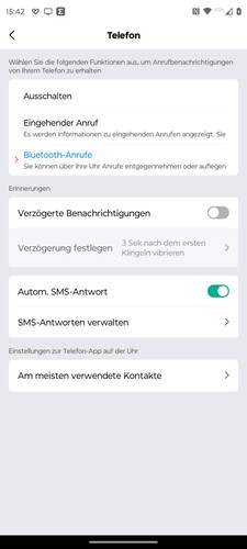 El smartwatch cuenta con su propia aplicación de teléfono en la que los usuarios pueden ver las listas de llamadas y los contactos más utilizados. Añadir contactos favoritos, hasta 50, debe hacerse manualmente en la app. El smartwatch también incluye un campo numérico para la introducción manual de números. La aplicación para smartphone ofrece la opción de notificar al reloj únicamente las llamadas entrantes o de gestionar las llamadas directamente con el reloj. Si un contacto no está guardado en la app Zepp, en el smartwatch sólo se mostrará el número para las llamadas entrantes, y no el nombre, aunque el contacto esté guardado en la app de teléfono del smartphone.