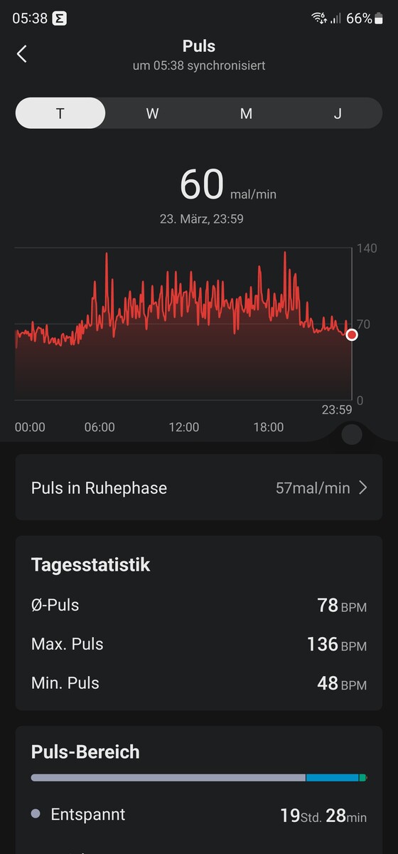 En nuestra prueba, la medición continua de SpO2 funciona de forma fiable. La saturación de oxígeno en sangre es un indicador importante del nivel de oxígeno, que debe ser lo suficientemente alto para poder proporcionar suficiente energía a los músculos. En nuestras mediciones, el wearable muestra una desviación máxima del 1% por encima y por debajo de los valores de nuestro dispositivo de referencia certificado médicamente. Sin embargo, Amazfit señala que la función SpO2 de la Band 7 no está pensada para el diagnóstico y la monitorización de procesos fisiológicos u otros fines médicos.