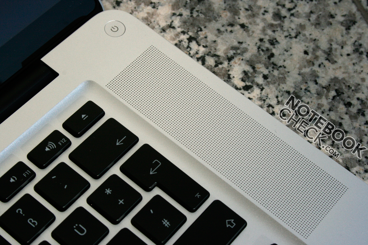 En contraste con la MacBook, los parlantes emiten el sonido a través de las partes perforadas al lado del teclado. Esto resulta en un sonido levemente mejor y un volumen máximo marginalmente más alto. Considerando su tamaño el sonido de los dos parlantes es bastante aceptable y apropiado para música de fondo o para ver vídeos. Los bajos están totalmente ausentes, sin embargo, los parlantes tienen un sonido aún más claro en el volumen máximo.