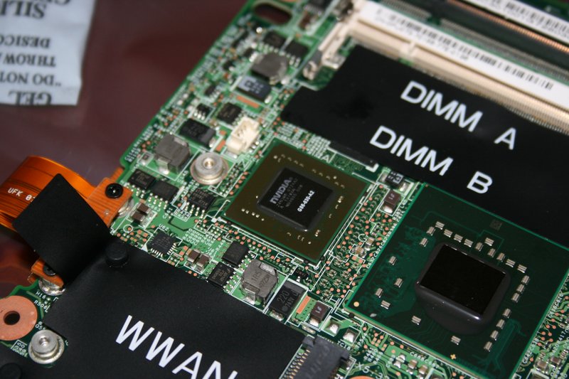Durante los primeros tests el notebook se puso perceptiblemente caliente y el ventilador se mantuvo apagado. Nosotros tratamos de solucionar el problema reinstalando Windows Vista. Pero, esta instalación no se completo exitosamente, debido a que el notebook se apago por sí mismo. En servicio en el sitio (el cual corrió suavemente) donde la placa madre y la completa solución de refrigeración fueron intercambiadas, nosotros pudimos tener algunas vistas del Dell XPS M1330. Aquí hay algunas fotos de esto.