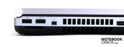 Hay dos puertos de audio, uno para usar con cascos y otro para el micrófono. Un puerto LAN RJ45 aparece junto al grabador DVD en el lado derecho. Si miras al otro lado de la esquina en la parte trasera del portátil, verás el puerto modem, RS232, toma de corriente, y el DisplayPort en el extremo izquierdo.