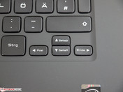 El teclado estilo chiclet tiene el formato estándar, pero sin pad numérico. Obviamente ha sido una decisión deliberada (el espacio estaría ahí), lo que lleva a una ventaja al centrar el touchpad respecto al teclado y el display (lo que da una posición más cómoda para las manos a la hora de mover el cursor, algo que prefieren muchos usuarios a la hora de trabajar en el propio regazo). Si es una decisión favorable o no dependerá de la cantidad de entrada de datos requerida. Las teclas tienen un desplazamiento medio-corto, un punto de presión preciso y bajo nivel de ruido. Las etiquetas del teclado son gris brillante, quedando iluminadas por el sistema de retroiluminación cuando se precisa. Siempre resultan fáciles de distinguir. La mayoría de teclas tienen un tamaño amplio (y no debería ser un problema) salvo por las delgadas teclas de intro y cursor, que están demasiado cerca entre sí.