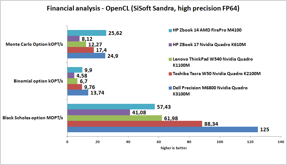Además de las habituales aplicaciones 3D, las GPUs con OpenCL también pueden calcular tareas más especializadas, tales como filtros de edición de imagen, encriptación de datos o efectos de luz-sombra. Las GPUs Nvidia son relativamente lentas en esas áreas e incluso pierden ante las soluciones integradas de Intel. Es la primera vez que podemos comparar los resultados con una AMD FirePro M4100 del HP ZBook 14 (análisis exhaustivo por venir). Según la secuencia de pruebas, la solución AMD logra resultados muy altos e incluso puede vencer a Quadros muy potentes. Como el Dell Precision M3800, nuestra Nvidia Quadro K1100M no es muy veloz y sólo puede vencer a la pequeña Nvidia Quadro K610M.