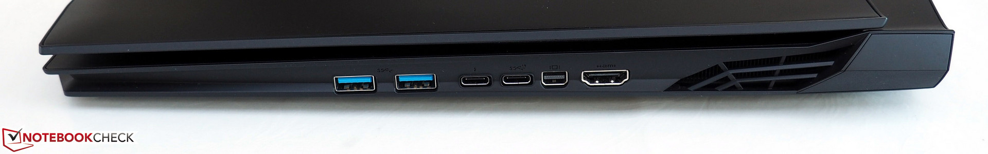 El dispositivo de 17" ofrece exactamente lo que cabe esperar de un portátil gaming de hoy día - salvo por el bloqueo Kensington. Si bien la trasera sólo tiene la toma de corriente, la parte izquierda tiene un puerto RJ45, un lector de tarjetas, dos clavijas de audio (auriculares & micrófono), y un puerto USB 3.0. La mayoría de conexiones están en el lado derecho: dos puertos USB 3.0, uno USB 3.1 Type-C Gen 2, y uno Thunderbolt 3. De la salida de vídeo se encargan un Mini-DisplayPort 1.3 o un HDMI 2.0 (4K@60 Hz). Combinado con el puerto Thunderbolt 3, esto quiere decir que puedes conectar tres pantallas externas.