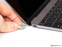 Ningun detalle del nuevo MacBook tuvo discusiones más controvertidas en lsa últimas semanas como la decisión de Apple de integrar sólo un puerto USB además del obligatorio puerto headset (clavija 3.5 mm estéreo), más precisamente un moderno puerto tipo C según el estándar USB 3.1 (Gen. 1) que se puede usar en ambas direcciones gracias a su construcción simétrica. Lo que es más, el puerto soporta el llamado "Modo Alterno" para la transmisión paralela de USB y señales de vídeo con el suministro simultáneo de corriente del portátil de hasta 100W (el MacBook, empero, sólo trae un adaptador de corriente de 29W). El útil conector MagSafe, que evitó muchos daños al conector y al puerto gracias a su fijación magnética, se reserva por tanto para las series MacBook Pro y MacBook Air – al menos mientras no se cambien también a puerto USB universal.