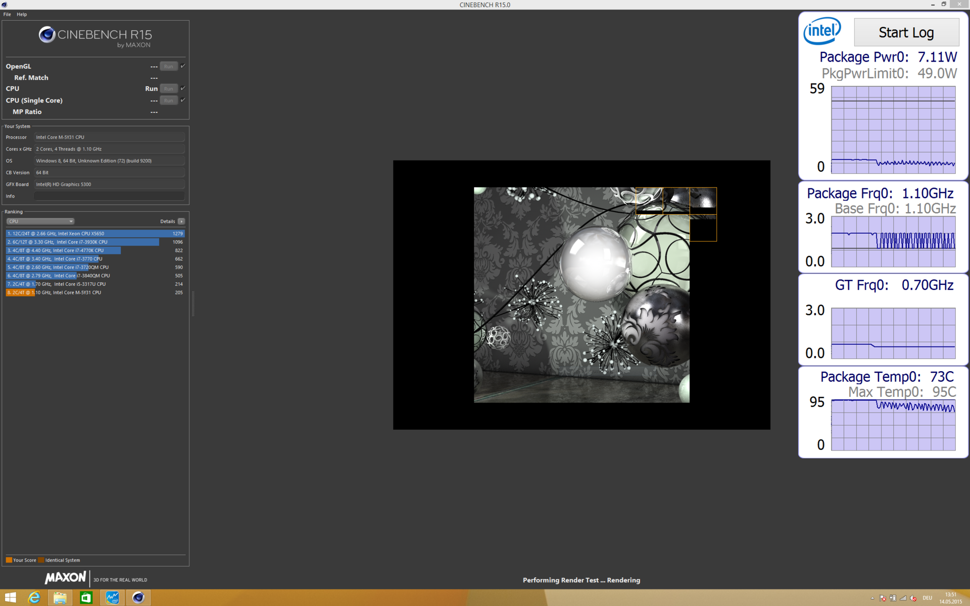 Similar a la HD Graphics 5500, la HD Graphics 5300 de la serie Core M tiene 24 Execution Units (arquitectura Intel Gen. 8, soporte DirectX 11.2), que van a 300-850 MHz en este caso. Esta horquilla se usa casi al completo en las pruebas cortas, por lo que el rendimiento 3D queda el 20% por detrás de dispositivos como el XPS 13 con soluciones de ventilación activa. SIn embargo, esto sólo funciona porque el Core M puede consumir más de 10 W cuando las temperaturas son bajas. Ambas frecuencia y rendimiento caerán mucho una vez se caliente el chasis – más al respecto en la siguiente sección.