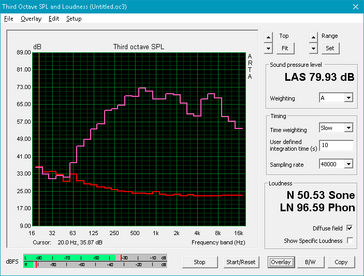 Como mencionamos anteriormente, el GL702VI aumenta y disminuye la velocidad de sus dos ventiladores de 12 V en el transcurso de varios minutos a niveles de carga más altos, y eso incluso cuando se aplica una carga constante. Mientras que el sistema permanece silencioso a solo 31 dB cuando está inactivo en el escritorio - el Alienware 17 R4 alcanza 36 dB aquí - la carga máxima da como resultado un ruido del ventilador de entre 52 y 57 dB. Solo el propio ROG G701VIK overclockable de Asus con Core i7-7820HK es igual de ruidoso. Lo mismo también es cierto durante nuestra prueba de Witcher 3: aquí, el sistema fluctúa entre 42.4 y 52 dB. Dado que los ventiladores son bastante grandes (parecen tener un tamaño de aproximadamente 60 mm), el ruido no es particularmente agudo, pero los auriculares son muy recomendables para cualquier otra cosa que no sea la navegación web o escribir textos.