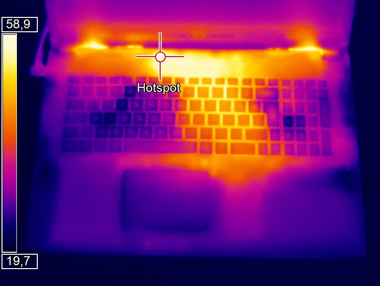 A diferencia del ruido de sistema, las temperaturas de la carcasa son aceptables. El modelo de pruebas no se calentó mucho durante el test de estrés con FurMark y Prime95 durante una hora. Difícilmente notarás el máximo de 51 °C (parte superior) y 54 °C (parte inferior) si el dispositivo de 17" no descansa directamente sobre tu regazo ya que estos valores se miden en el tercio trasero de la carcasa. La parte WASD y el reposamanos izquierdo están bastante más frescos y son más cómodos incluso durante las largas sesiones de juego (ver los resultados de Witcher 3).