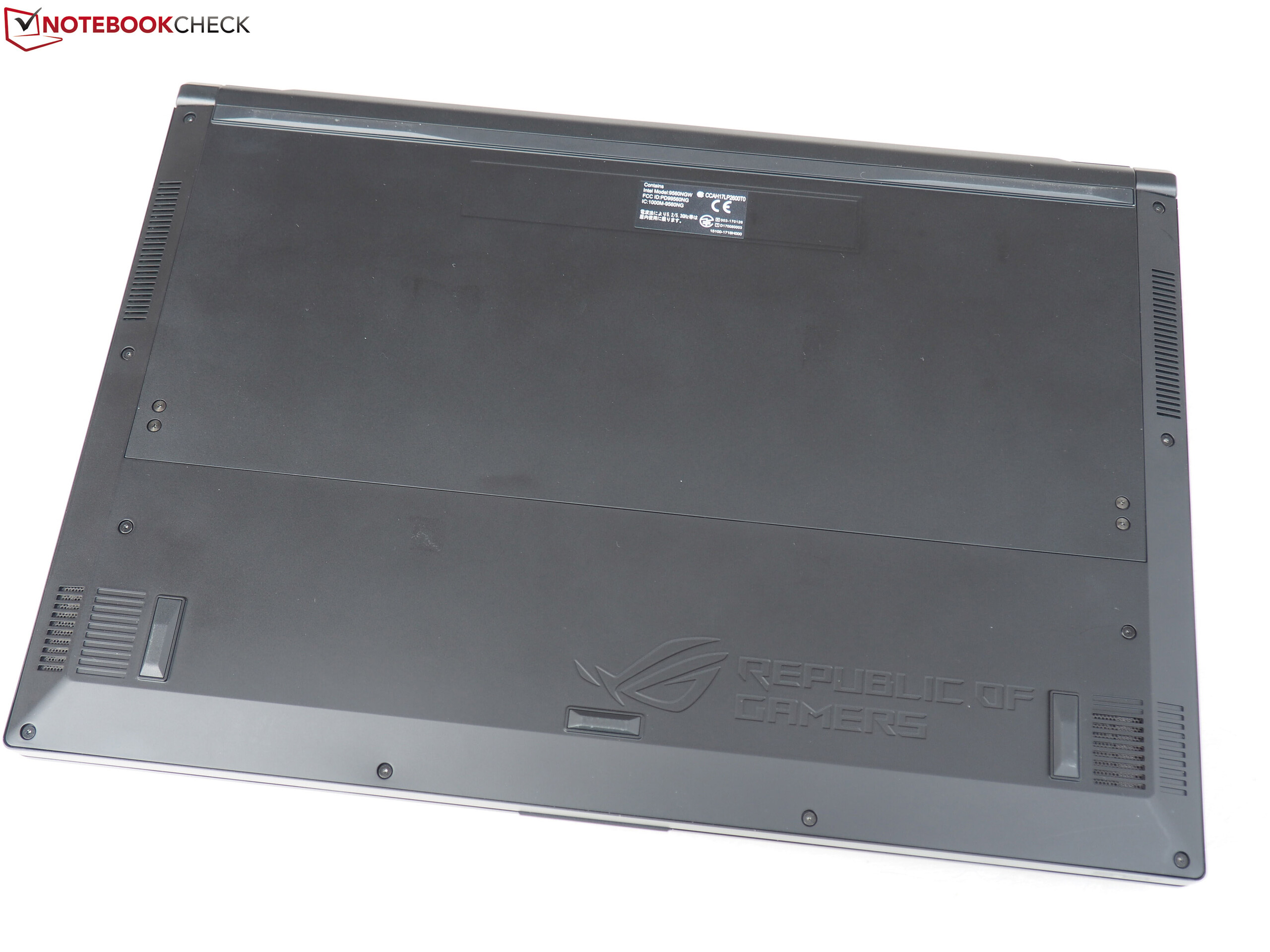Uno de los aspectos más singulares de la GX501, la elevación de la parte inferior de la unidad base cuando se abre el dispositivo (supuestamente para mejorar la refrigeración) se ha mantenido en la GM501. Este "truco" permite a Asus colocar una GPU muy potente en una carcasa sorprendentemente delgada. Con una altura de sólo 2,0 cm (~0,78"), el dispositivo de 15" es uno de los portátiles para juegos más delgados disponibles actualmente. Su peso de sólo 2,5 kg (~5,5 lb) también es muy bajo para un dispositivo de gama alta, aunque los otros dispositivos de nuestro campo de comparación pesan aún menos (el MSI GS63VR pesa sólo 1,9 kg/~4,2 lb).