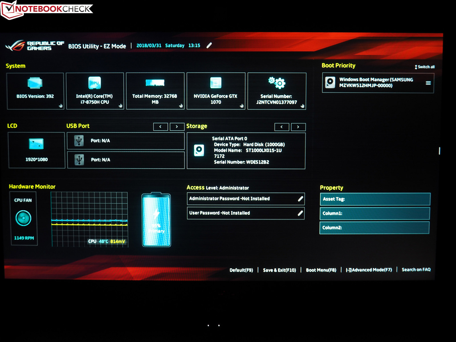Para bajar el precio, el fabricante no ha incluido la GeForce GTX 1080 Max-Q, como lo hizo en la GX501VI, sino "solo" una GTX 1070, que ofrece resultados de rendimiento casi idénticos ya que no es una versión de Max-Q . Una gran desventaja es el alto nivel de ruido, como verá más adelante. La GTX 1070 Max-Q también habría significado un mejor consumo de energía y menos calor residual.