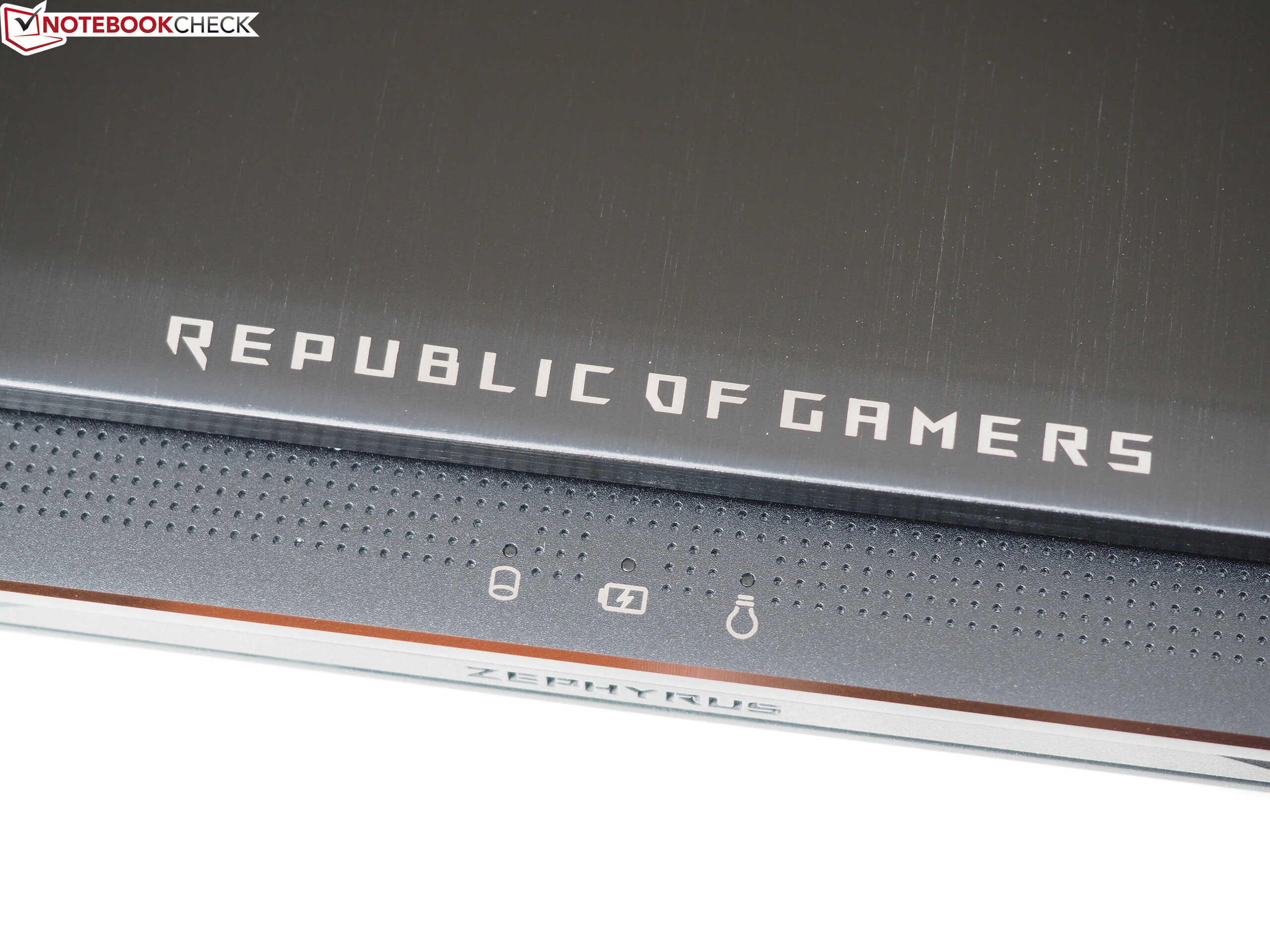 La estabilidad de la carcasa es decente o incluso buena. Cuando está abierto, la unidad base solo se deforma bajo presión en el centro hacia la parte posterior. Como en la mayoría de los portátiles, la cubierta de la pantalla no es muy resistente a la deformación. Los fanáticos de la iluminación estarán contentos con el GM501. No solo el teclado, sino también el logotipo de Asus en la cubierta y las salidas de aire en el lateral tienen luz de fondo. El fabricante podría mejorar las bisagras un poco. Dan una buena impresión y mantienen la pantalla en posición, pero son bastante audibles debido a sus engranajes.