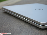 La tapa, como el chasis, consiste en una enorme pieza de aluminio. Los bordes han sido pulidos hasta un gran brillo, lo que causa una impresión muy atractiva. Dell se decidió por una bisagra contínua, también de aluminio (al menos la junta que lo cubre). Mantiene la tapa firmemente en su posición; para abrirla tuvimos que mantener la base contra la mesa firmemente.