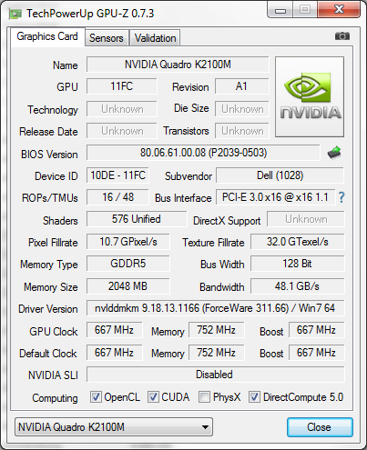 La Nvidia Quadro K2100M es la sucesora inmediata de la Nvidia Quadro K2000M que se instalaba frecuentemente en las estaciones de trabajo móviles del modelo del año pasado. Ahora cuenta con 576 Shader Units, su velocidad base es de 666 MHz y la memoria gráfica GDDR5 va a 752 MHz. Como es habitual, la Quadro está optimizada para las aplicaciones profesionadas, tiene una BIOS especial y drivers dedicados. Esto le permite acelerar funciones OpenGL individuales de forma significativa lo que suele ser beneficioso para el software profesional.