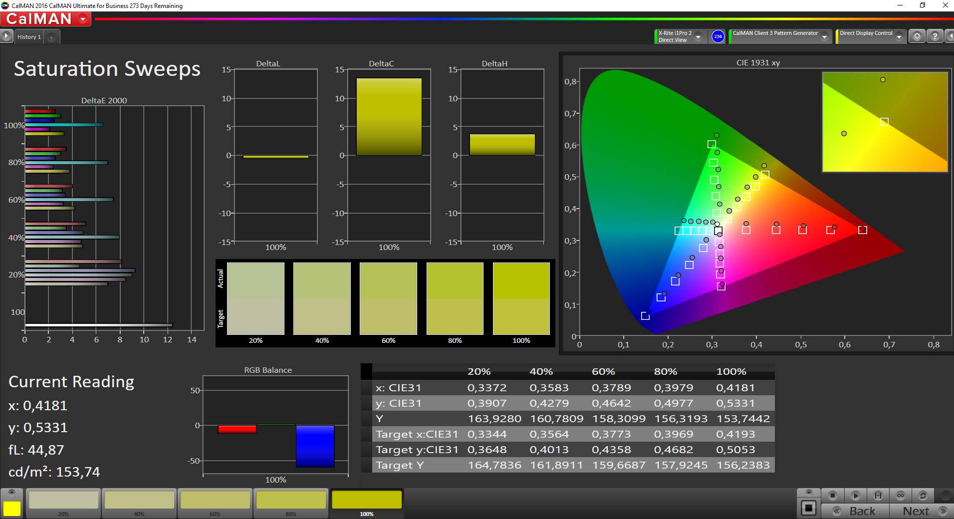 Nuestras mediciones iniciales dan resultados mucho mejores que las del T460s. El brillo medio es decente con 311 nits y el valor de negro también es muy bueno con sólo 0.25 cd/m², lo que resulta en un contraste genial de 1300:1. Subjetivamente, ya nos gusta la imagen de fábrcia, pero hay cierto tinte verdoso. El panel no usa PWM para controlar el brillo.