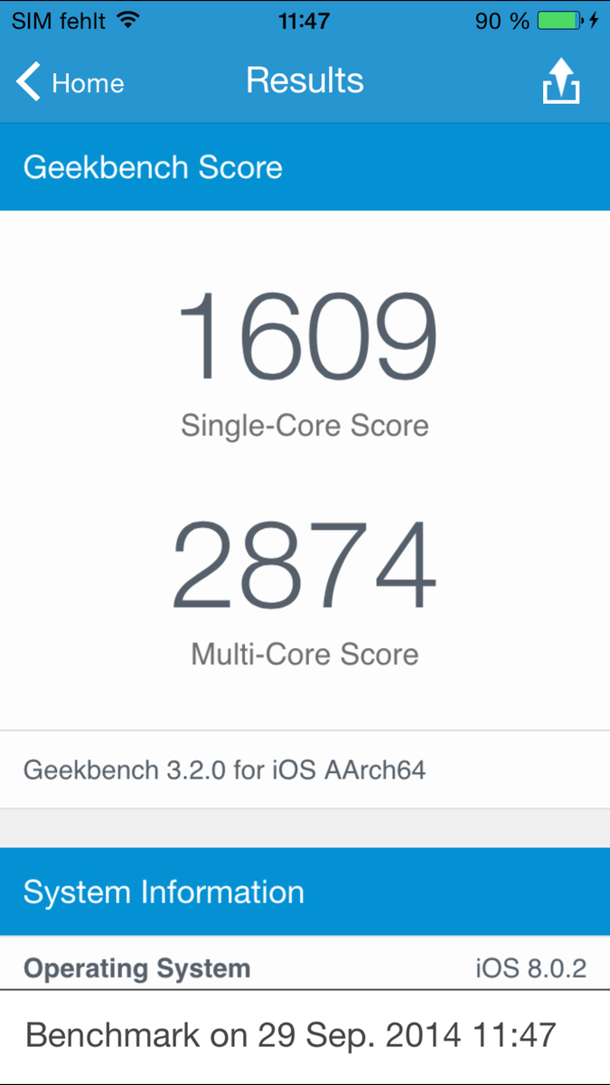 Nuestro modelo de pruebas va a la par con la versión más pequeña en las pruebas. El rendimiento por MHz del procesador es realmente genial y muestra que la CPU dual-core es completamente suficiente en combinación con un sistema operativo optimizado. Sólo el Samsung Galaxy S5, a pesar de tener el doble de núcleos, logra seguirle el ritmo a la CPU Apple en el test Geekbench 3 Multi-Core. Sin embargo, esperamos que esto cambie con el próximo Snapdragon 805, que debería estar disponible en algunos dispositivos este mes. Sólo el K1 de la tablet NVIDIA Shield es ya más rápido ya que usa todos los núcleos. Nuestro modelo de pruebas es algo más lento que el iPhone 6, lo que podría estar causado por apps que no soportan la resolución nativa del display, por lo que el iPhone 6 Plus tiene que escalar el contenido.
