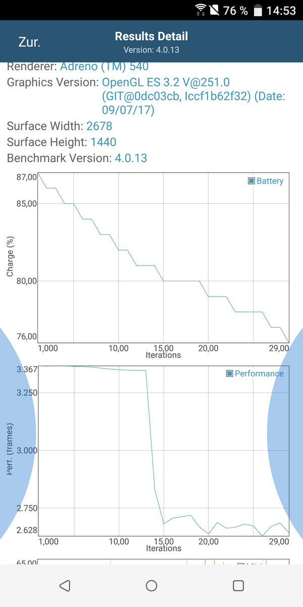Usamos el GFXBench battery test para ver cómo aguanta el SoC bajo cargas extremas. Lo ejecutamos tres veces seguidas y monitorizamos no sólo el nivel de batería, sino también los frame rates. En la prueba T-Rex, el smartphone permanece estable durante un tiempo bastante largo antes de que el rendimiento caiga un 20 % a mitad de la prueba. El dispositivo muestra un comportamiento similar en la parte Manhattan, sólo esta vez el rendimiento cae aún más bajo.