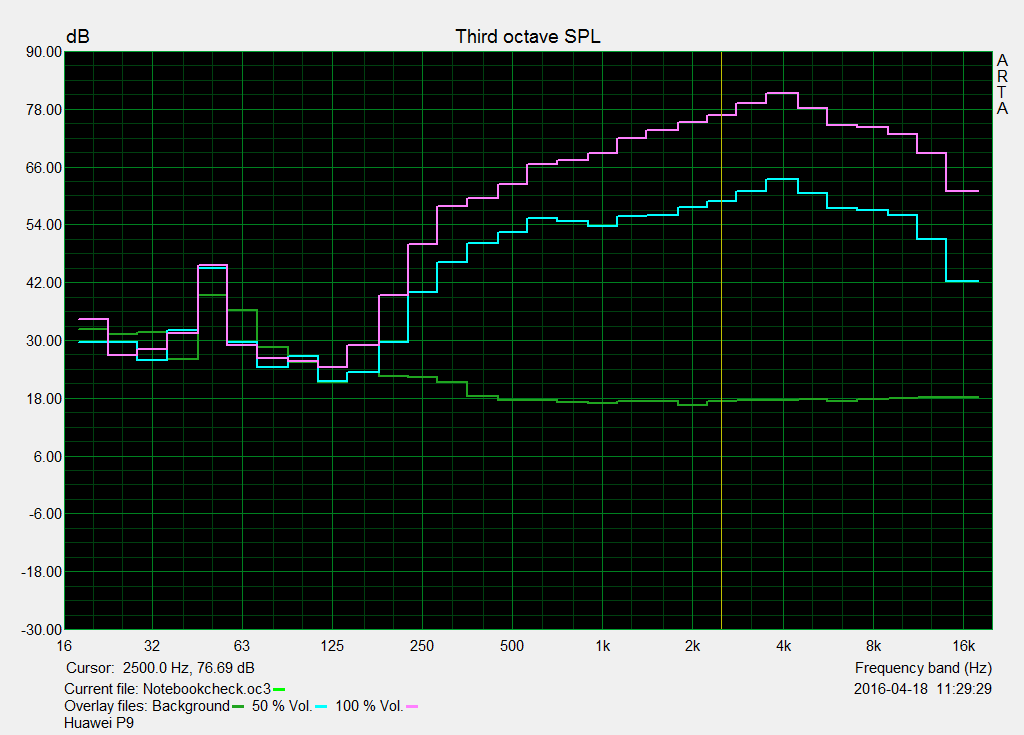 El Huawei P9 tiene un altavoz mono junto al puerto USB del smartphone. Así se puede poner el dispositivo sobre una mesa sin cubrir el altavoz. La calidad es bastante decente a volumen medio e incluso logra renderizar notas medias. El P9 alcanza una presión acústica de hasta 87.91 dB(A) a volumen máximo, lo que es relativamente alto. Por desgracia, los componentes tienden a distorsionar ligeramente como hemos visto en el diagrama de ruido rosa. Los agudos en particular se saturan entonces.