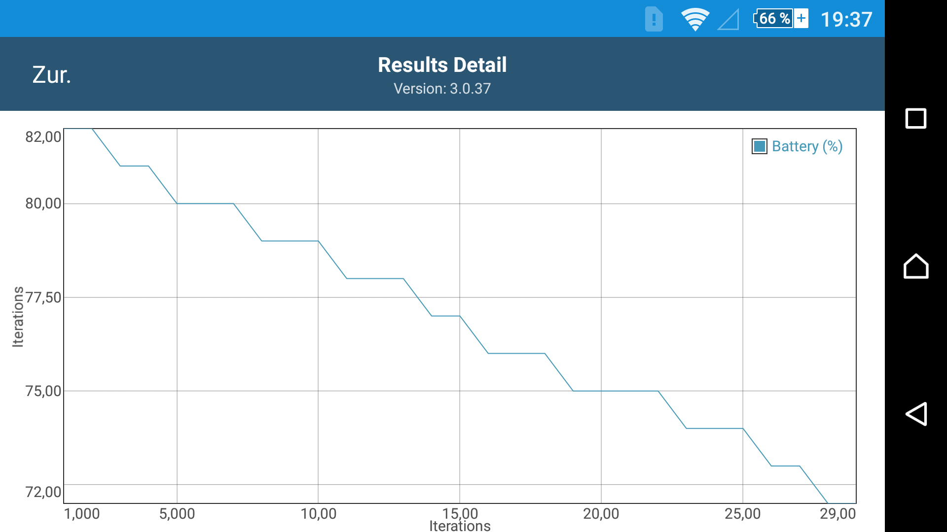 Usamos el test de batería de GFXBench 3.0 para comprobar la consistencia del rendimiento del SoC. Usa el test T-Rex treinta veces seguidas y registra los frame rates así como la capacidad de la batería. Podemos ver una fuerte ralentización rápidamente, y el smartphone acabará perdiendo casi el 50% de su rendimiento. Esto quiere decir que tienes que vivir con pequeños trastabilles cuando juegas mucho rato. Es un auténtico fiasco cuando tienes en cuenta el rendimiento posible del SoC. Sin embargo, el Z3+ sigue siendo más del doble de rápido que el Huawei P8 (T-Rex HD Onscreen Cs4Z16: 11fps) a pesar de la ralentización.