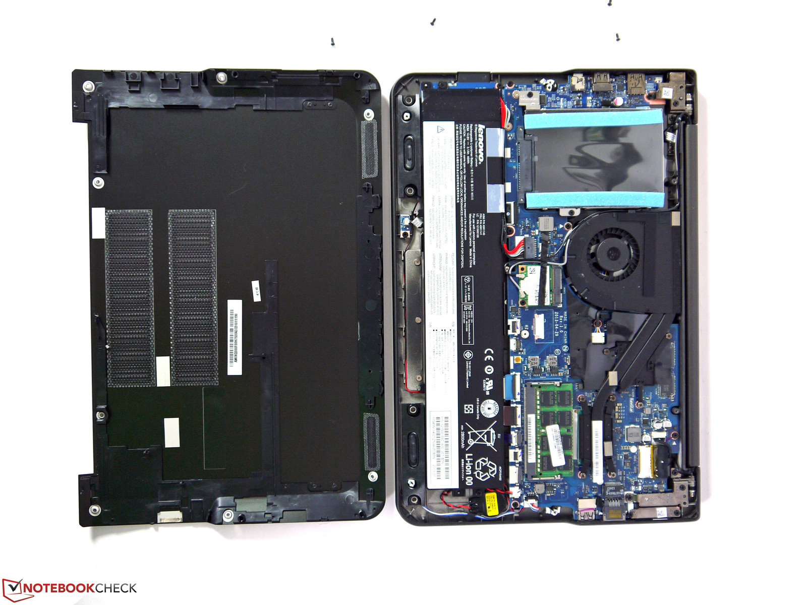 Todos los componentes esenciales se encuentran bajo la tapa en la parte inferior. Pueden integrarse varios dispositivos de 2.5 pulgadas con una altura máxima de 7 mm. Adicionalmente hay disponible una ranura M.2. para acomodar dispositivos de solo lectura. La memoria principal está limitada a un máximo de 8 GB DDR3L (1.600Mhz) por ranura. Nuestro modelo de prueba estaba totalmente equipado. Los módulos de los modelos con 4 GB de RAM pueden sustituirse por módulos de más capacidad. Además el ventilador y la batería (atornillada) son accesibles, por lo que la batería puede reemplazarse en caso de daño.
