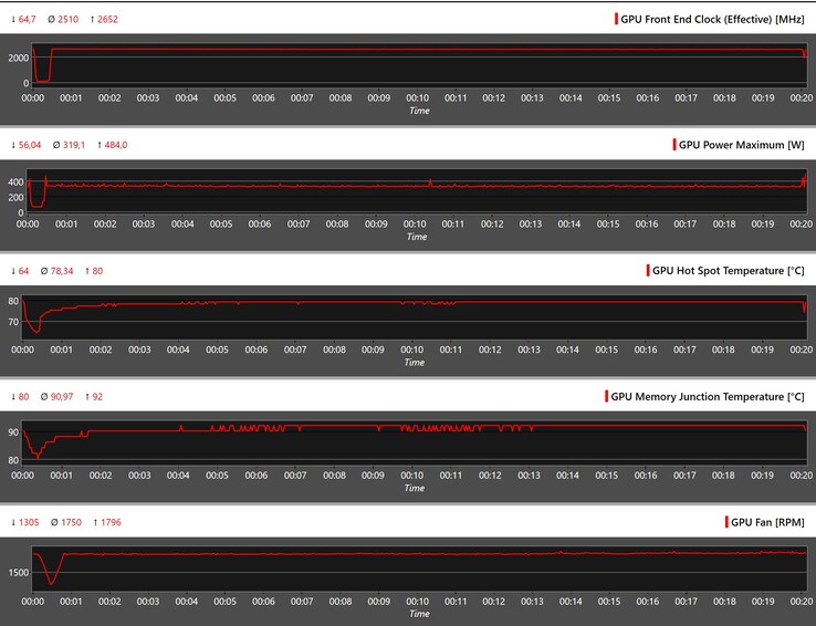Vemos un máximo de 86 °C como valor de punto caliente de la GPU para el modelo XTX. La GPU sólo se ralentiza por encima de los 110 °C, lo que puede provocar una pérdida de rendimiento. Mientras tanto, la VRAM se calienta un poco más, alcanzando los 94 °C en la prueba de estrés. En el modelo XT, vemos temperaturas igual de altas con la VRAM, aunque la GPU funciona constantemente más fría que su prima mayor.