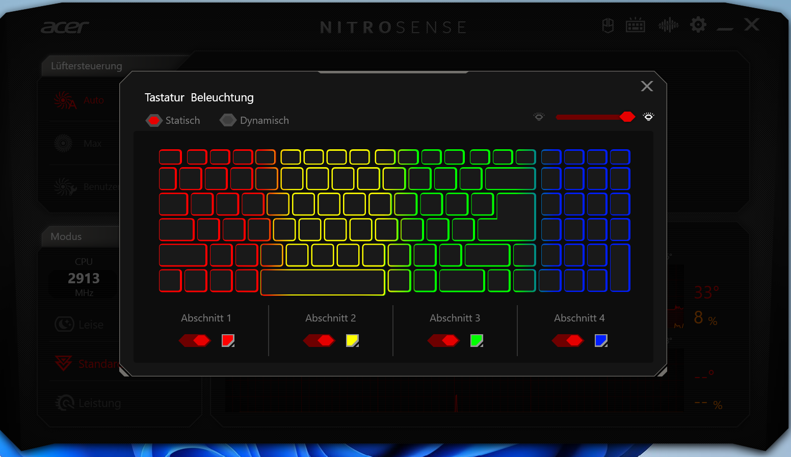 El software NitroSense preinstalado (el centro de control del portátil, ver imágenes) puede utilizarse para cambiar entre los perfiles de rendimiento establecidos por el fabricante ("rendimiento", "estándar" y "silencioso"). Realizamos todas nuestras pruebas con el perfil "estándar" y con el control del ventilador en automático. El rendimiento de la CPU es el mismo en todos los perfiles de rendimiento; el rendimiento de la GPU varía ligeramente.